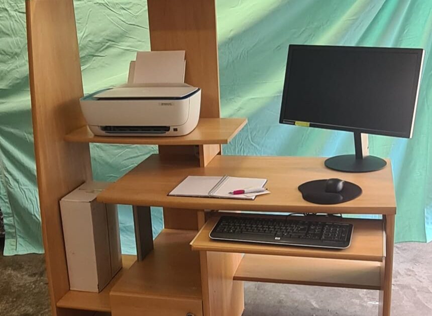 En bois de couleur hêtre, il y a un emplacement pour une imprimante, un écran et un clavier. En très bon état.